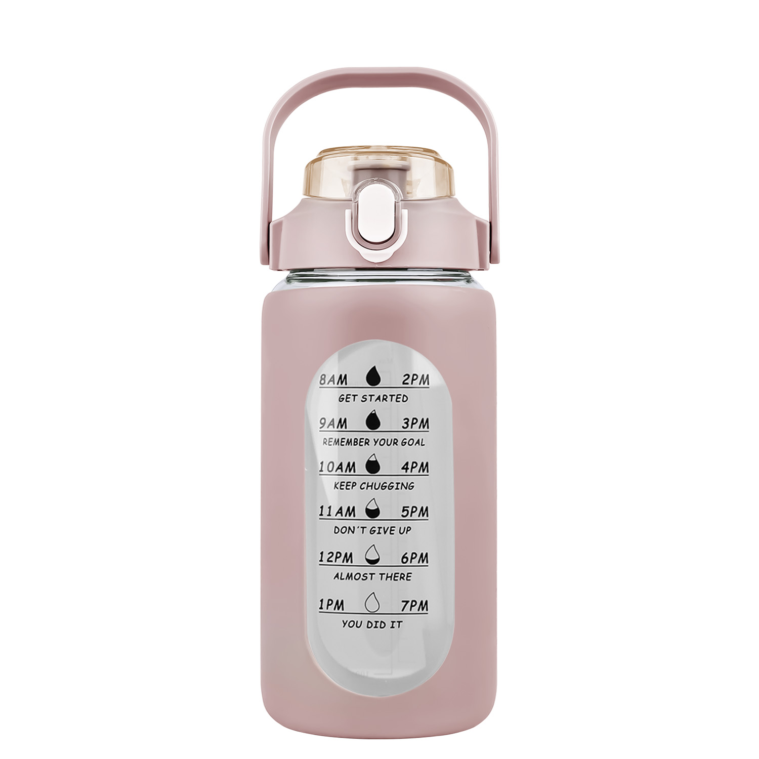 Are you tired of forgetting to stay hydrated throughout the day? Look no further than our motivational water bottle! Comes with timer markers and and precise volume on the side, helping you track your water intake with ease. With its large capacity(32Oz or 64 Oz), you can refill the sports water bottle up less frequently and keep yourself refreshed all day long. Made of high borosilicate glass, suitable for both warm and cold beverages, heat-resistant, dishwasher safe and healthy to use. Slip resistant with silicone sleeve and easy to carry with a built-in handle. And for added convenience, it features a built-in straw, making it easy to drink water on the go. Plus, its stylish design and motivational messages will inspire you to keep pushing towards your health goals. So why wait? Invest in our water intake tracker bottle today and take the first step towards a healthier, happier you!