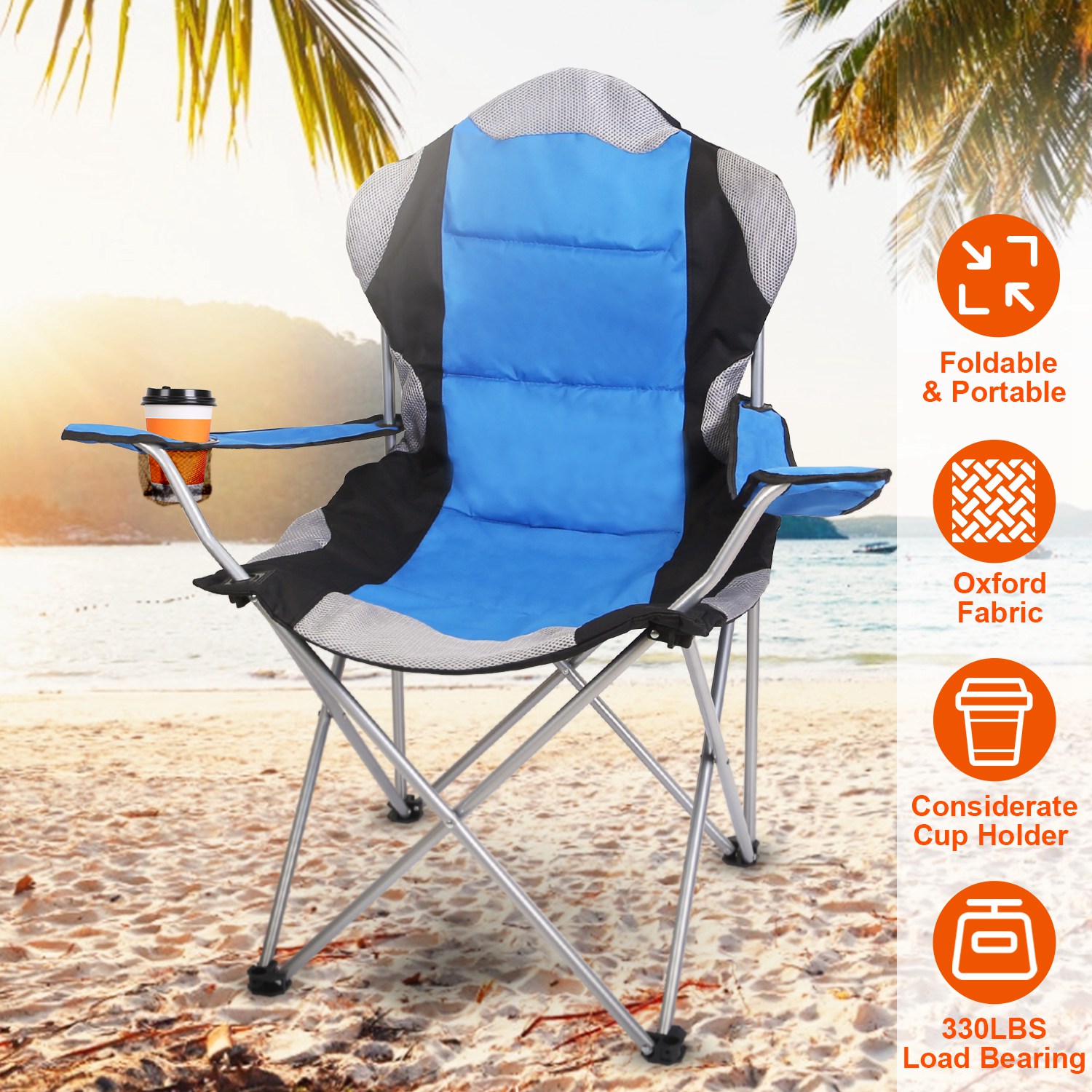 Home > Foldable Camping Chair Heavy Duty Steel Lawn Chair Padded Seat Arm Back Beach Chair 330LBS Max Load with Cup Holder Carry Bag