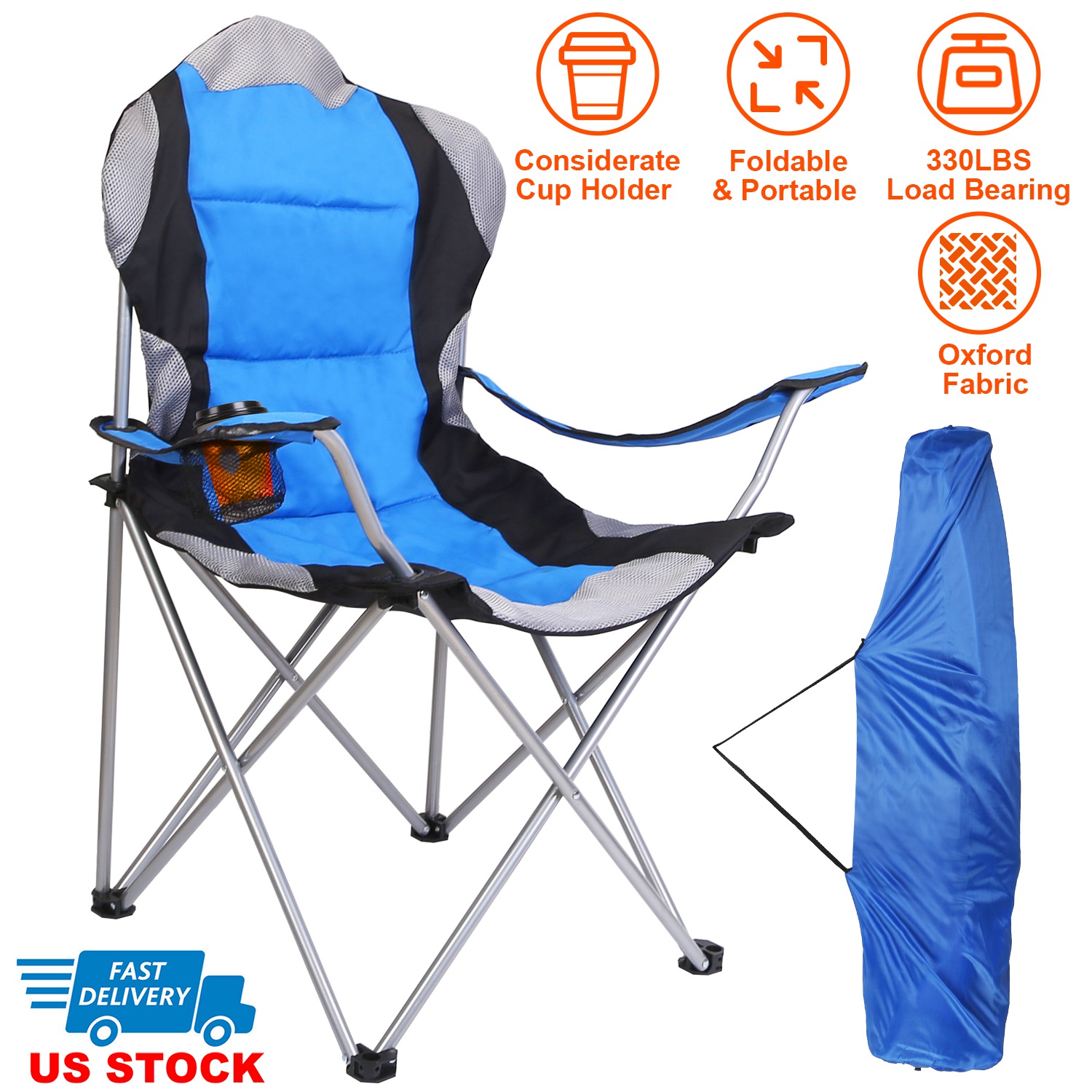 Let’s enjoy the fun and leisure time in outdoor life. Camping chair with sturdy steel frame creates the perfect balance between comfort and functionality. This camping chair is perfect for camping, sports, fishing and travel. Premium Oxford fabric with steel tube ensures you 330lbs max load. Cotton padded seat, armrest and back renders you comfortable seating. Set up quickly, can be opened and folded within seconds and packs easily back into its carry bag for storage or travel. Mesh cup holder keeps a beverage within reach. Carry bag included for easy transport and storage.