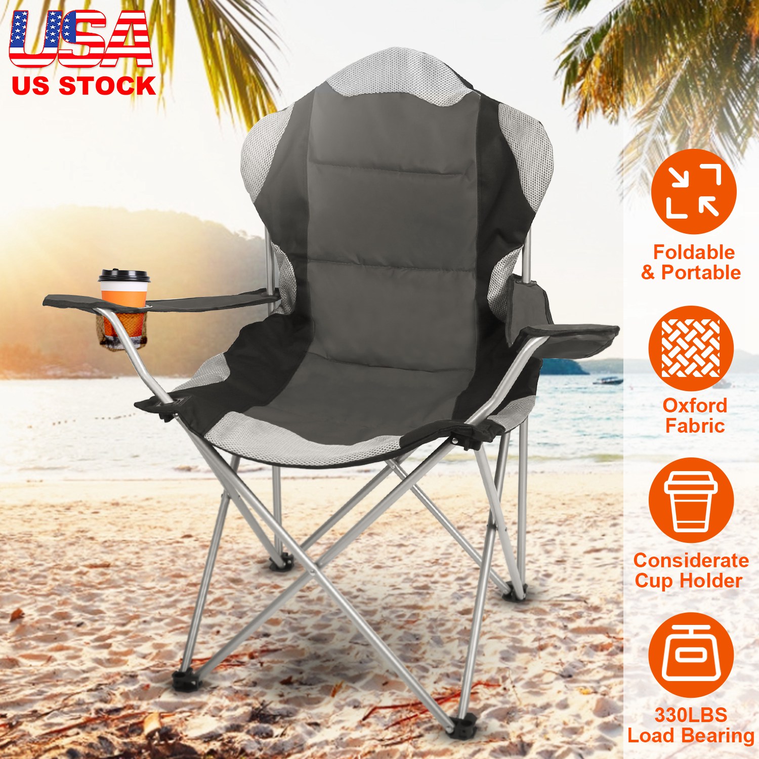 Let’s enjoy the fun and leisure time in outdoor life. Camping chair with sturdy steel frame creates the perfect balance between comfort and functionality. This camping chair is perfect for camping, sports, fishing and travel. Premium Oxford fabric with steel tube ensures you 330lbs max load. Cotton padded seat, armrest and back renders you comfortable seating. Set up quickly, can be opened and folded within seconds and packs easily back into its carry bag for storage or travel. Mesh cup holder keeps a beverage within reach. Carry bag included for easy transport and storage.