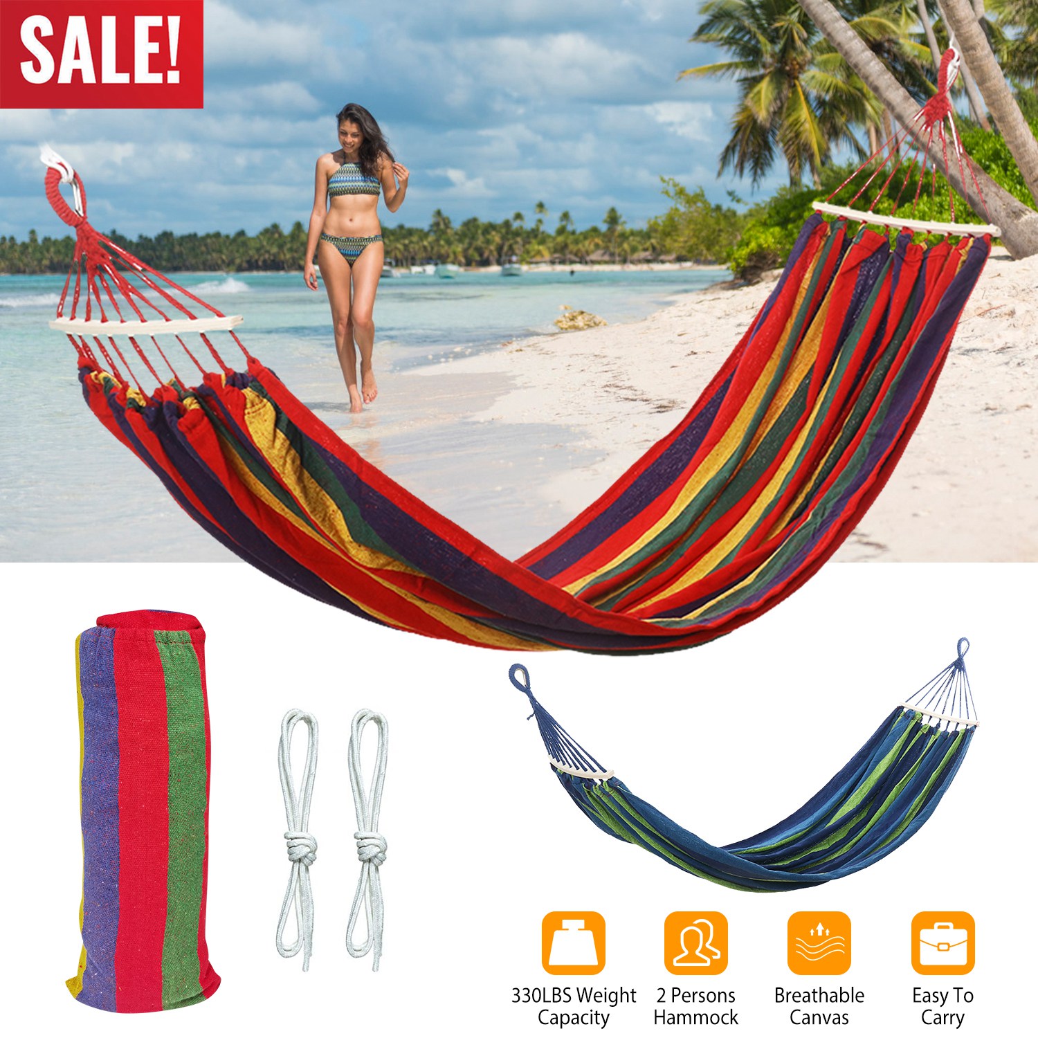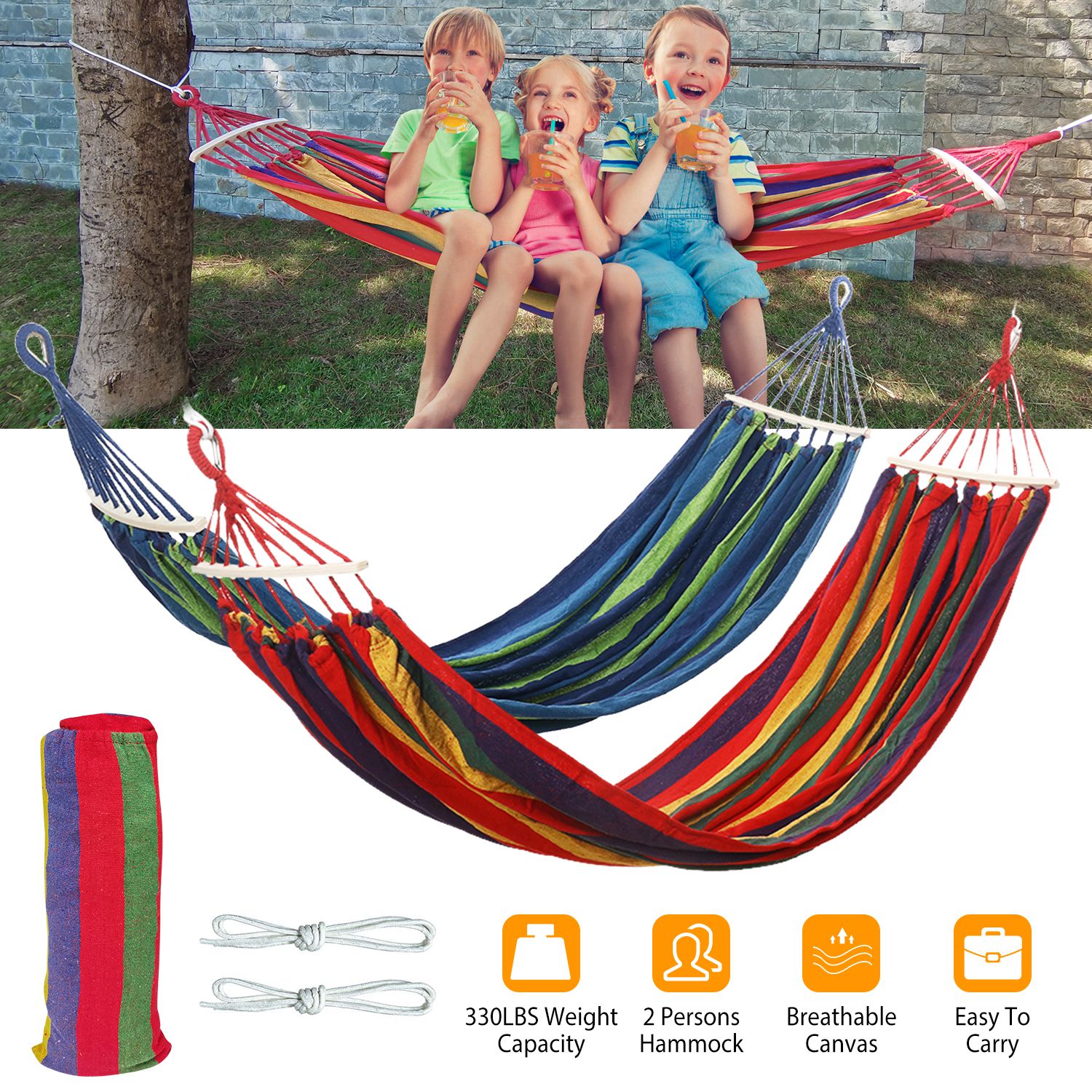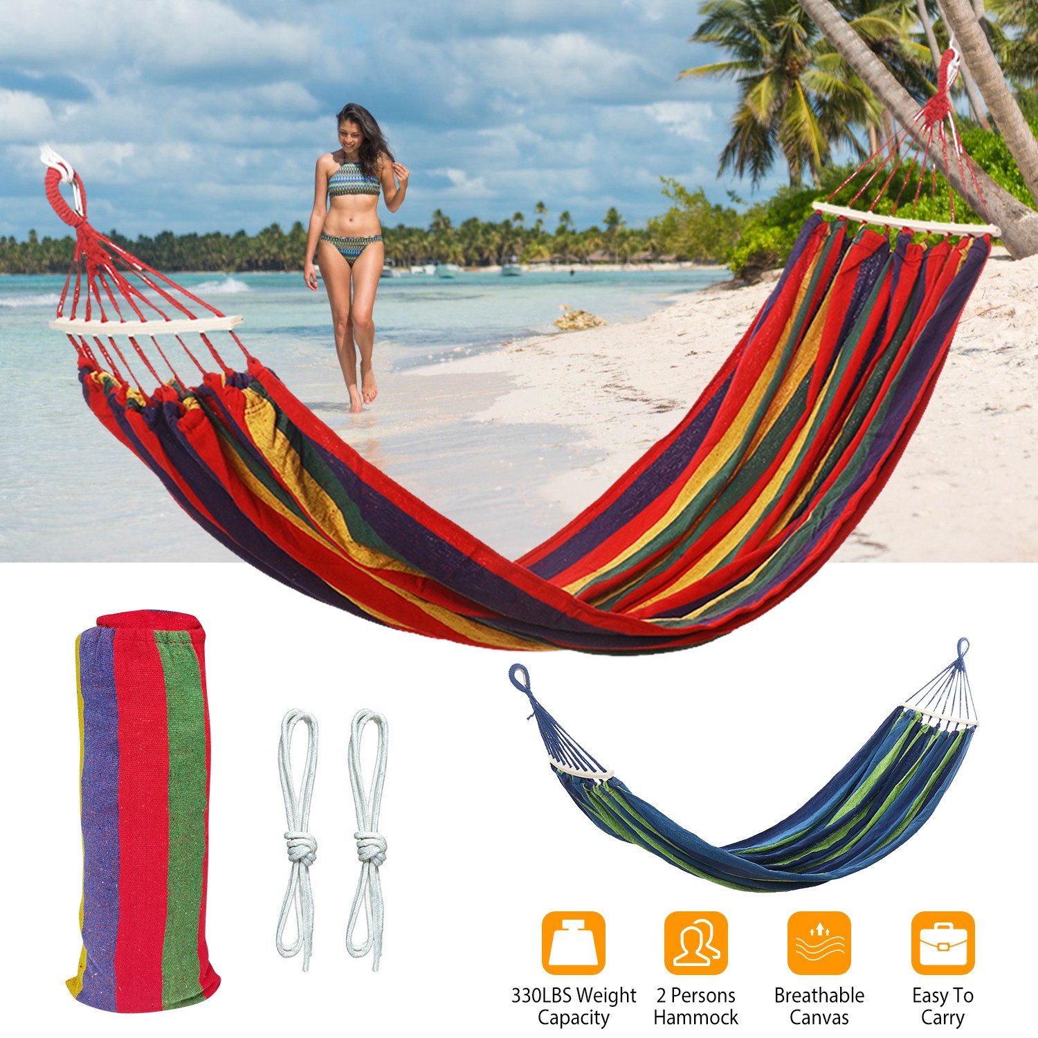 Home > Double Hammock 2 Person Canvas Hanging Hammock Swing Bed with Carrying Bag Hold 330LBS for Camping Travel Beach