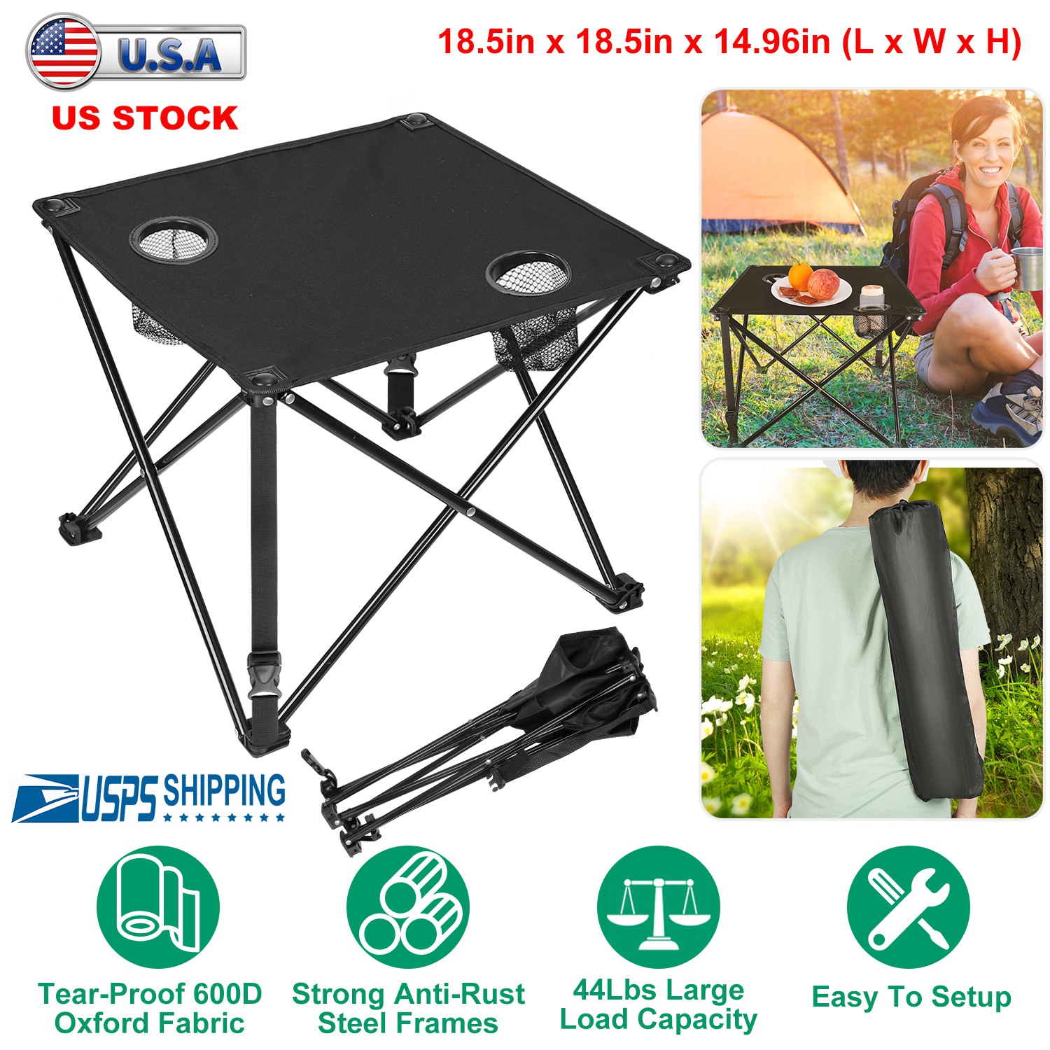 Whether you’re camping, backpacking, or enjoying a casual picnic, this lightweight portable folding table is a reliable companion for keeping advanced 600D Oxford fabric that is tear-resistant and scratch-resistant, with a waterproof PVC coating on the underside for added protection. Designed with two built-in cup holders, it securely holds drinks to prevent spills. The X-shaped frame is constructed from heavy-duty steel with a rust-resistant finish, delivering stable support with a load capacity of up to 44 lbs. Two reinforced buckle straps further enhance stability. Tool-free and quick to set up, this table combines convenience, durability, and outdoor-ready performance.