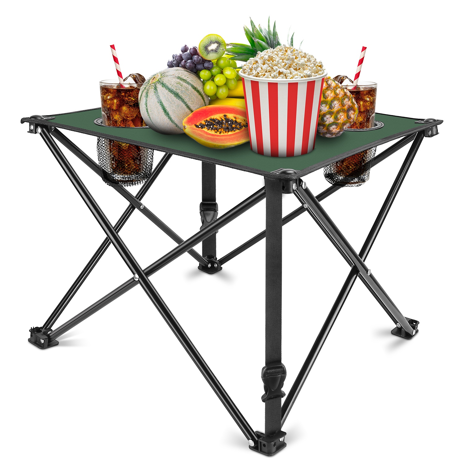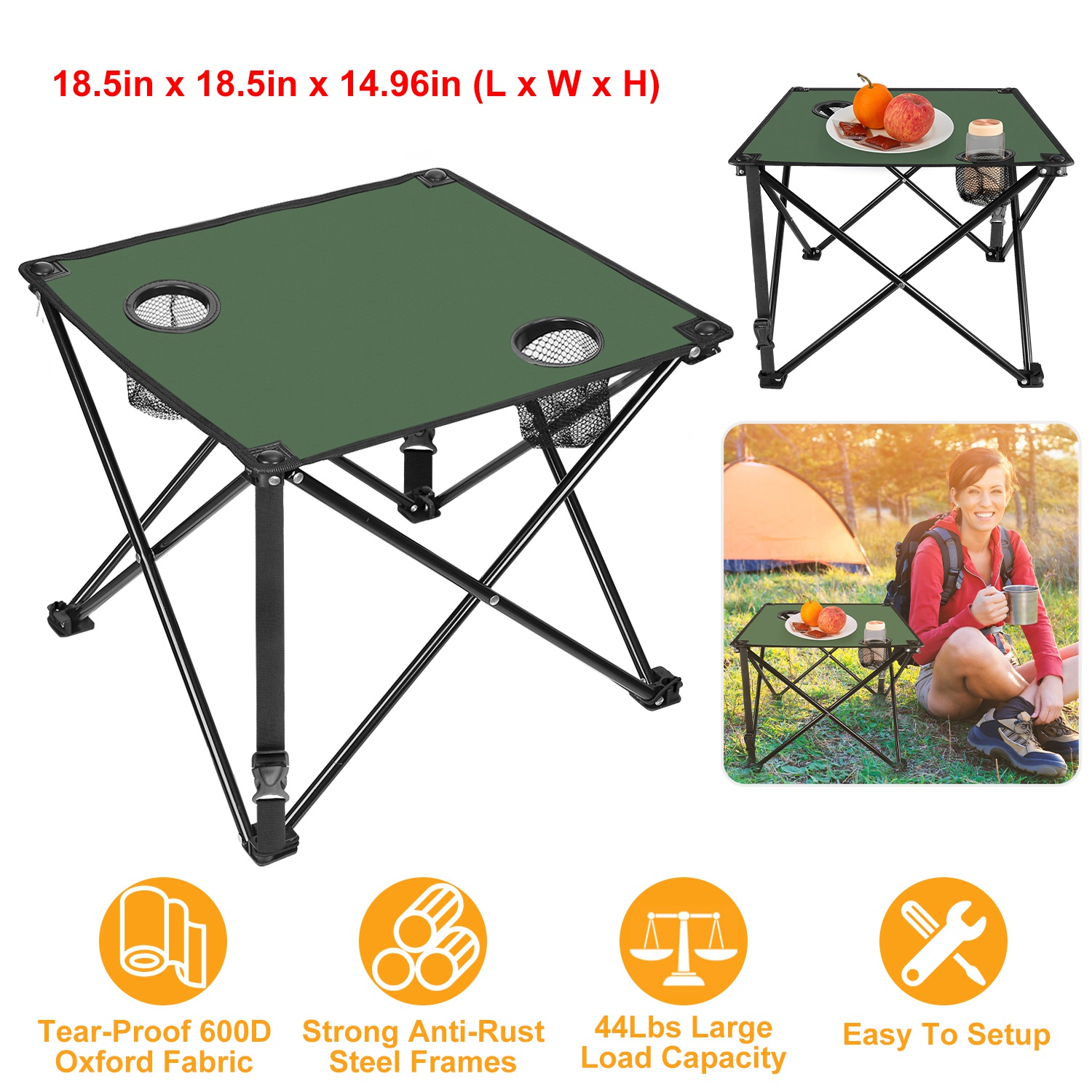 Whether you’re camping, backpacking, or enjoying a casual picnic, this lightweight portable folding table is a reliable companion for keeping advanced 600D Oxford fabric that is tear-resistant and scratch-resistant, with a waterproof PVC coating on the underside for added protection. Designed with two built-in cup holders, it securely holds drinks to prevent spills. The X-shaped frame is constructed from heavy-duty steel with a rust-resistant finish, delivering stable support with a load capacity of up to 44 lbs. Two reinforced buckle straps further enhance stability. Tool-free and quick to set up, this table combines convenience, durability, and outdoor-ready performance.