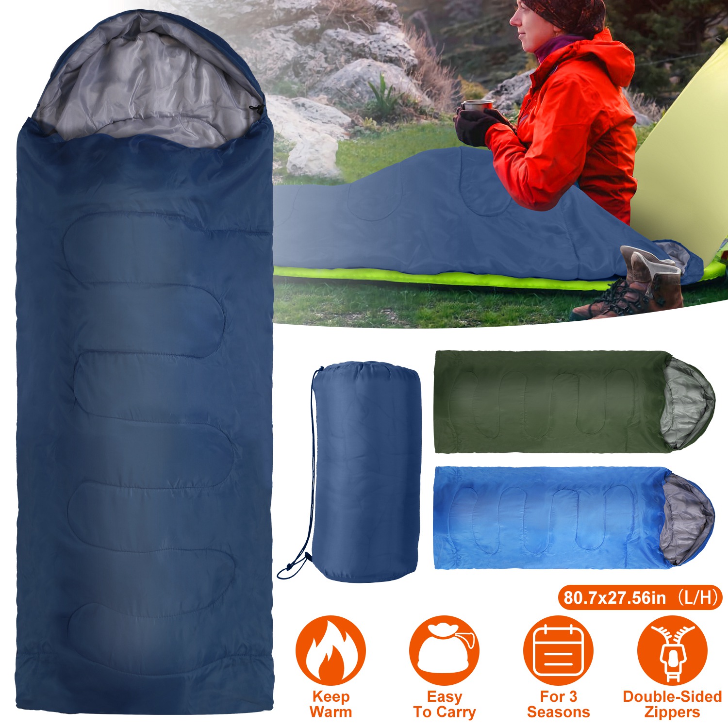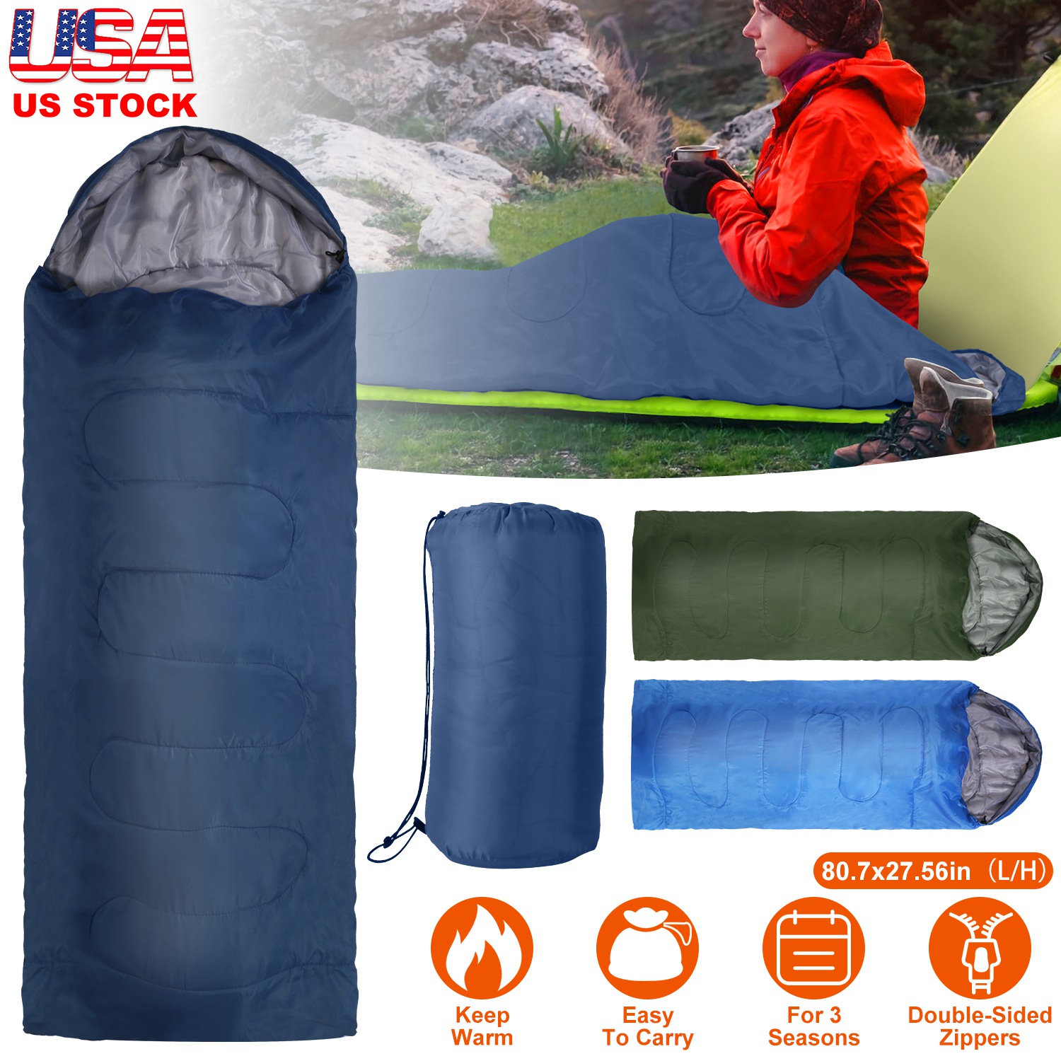 Our sleeping bags are designed to provide you a warm and cozy sleep in cold damp night after a tiring day of outdoor exploration. Its comfortable temperature is at 50℉, great for 3 seasons use(Spring, Autumn, Winter). Made of 170 polyester lining and filled with soft hollow cotton, the sleeping bag is warm and lightweight. Included carry bag makes it quite convenient to store and carry. No more lugging around excessive weight in your backpack. After unzip the sleeping bag, you can also use it as a large quilt or mat. Perfect for hiking, camping, mountaining, etc.. Besides, sleeping bag of navy blue, army green and royal blue are provided for you to choose.