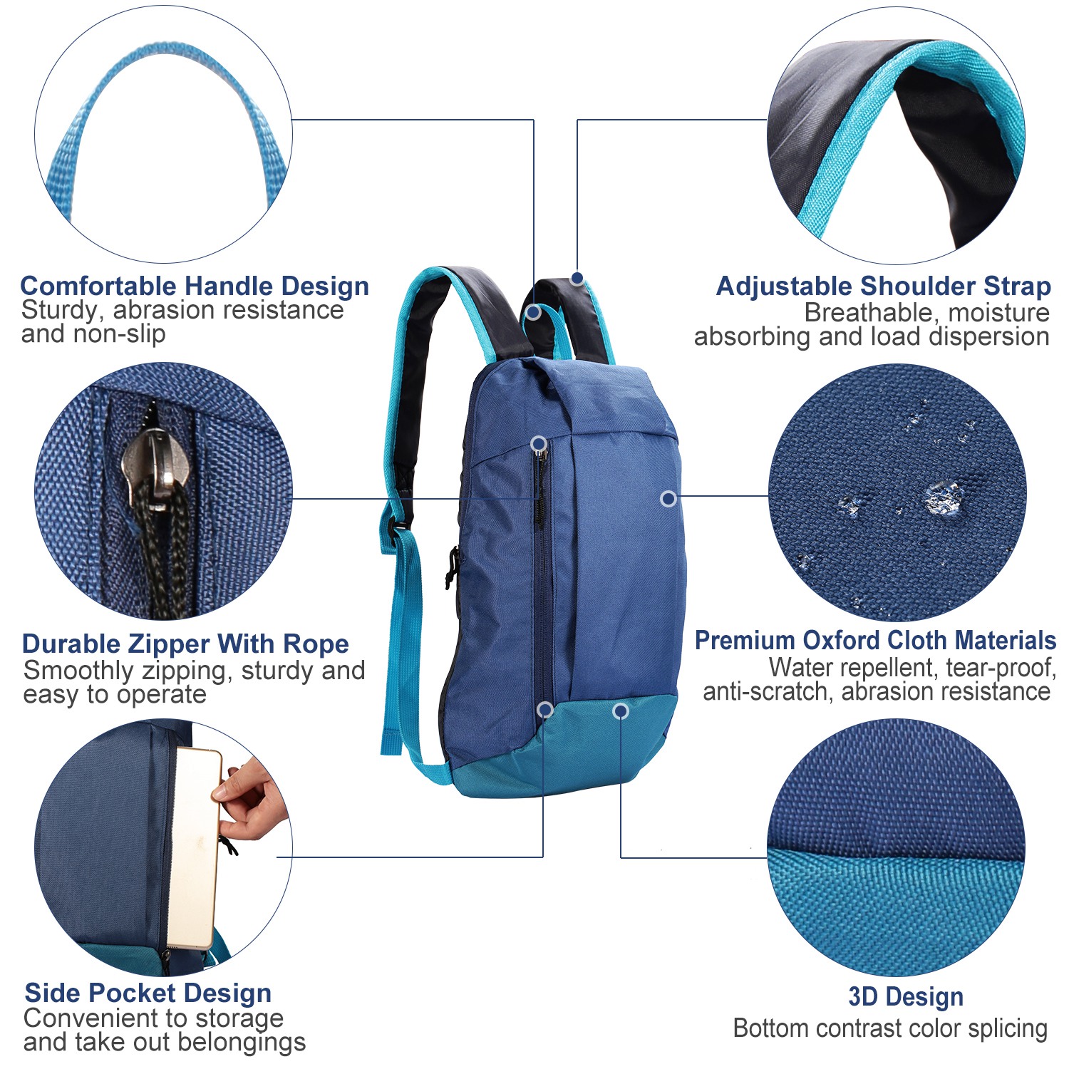 Made from premium oxford cloth materials, our outdoor sport backpack is sturdy, durable and can bear around 7.5kg/16.52lbs -weight objects. At the same time, it is light weight (Around 18g/0.26lbs) to almost not add any load to your back and has an adjustable capability of 10L to storage your personal belongings as much as possible when you are doing sports, traveling, going hiking, climbing, cycling and more. Additionally, built-in 0.5cm/0.2in-thickness air cushion and adopts ergonomically well-tailored design, the shoulder strap is breathable, moisture absorbing and load dispersion.