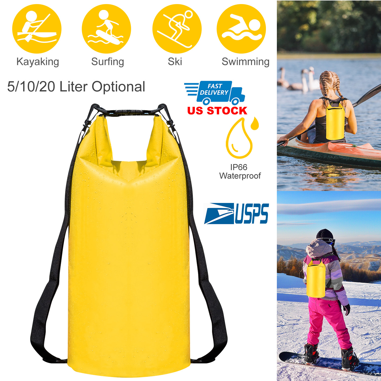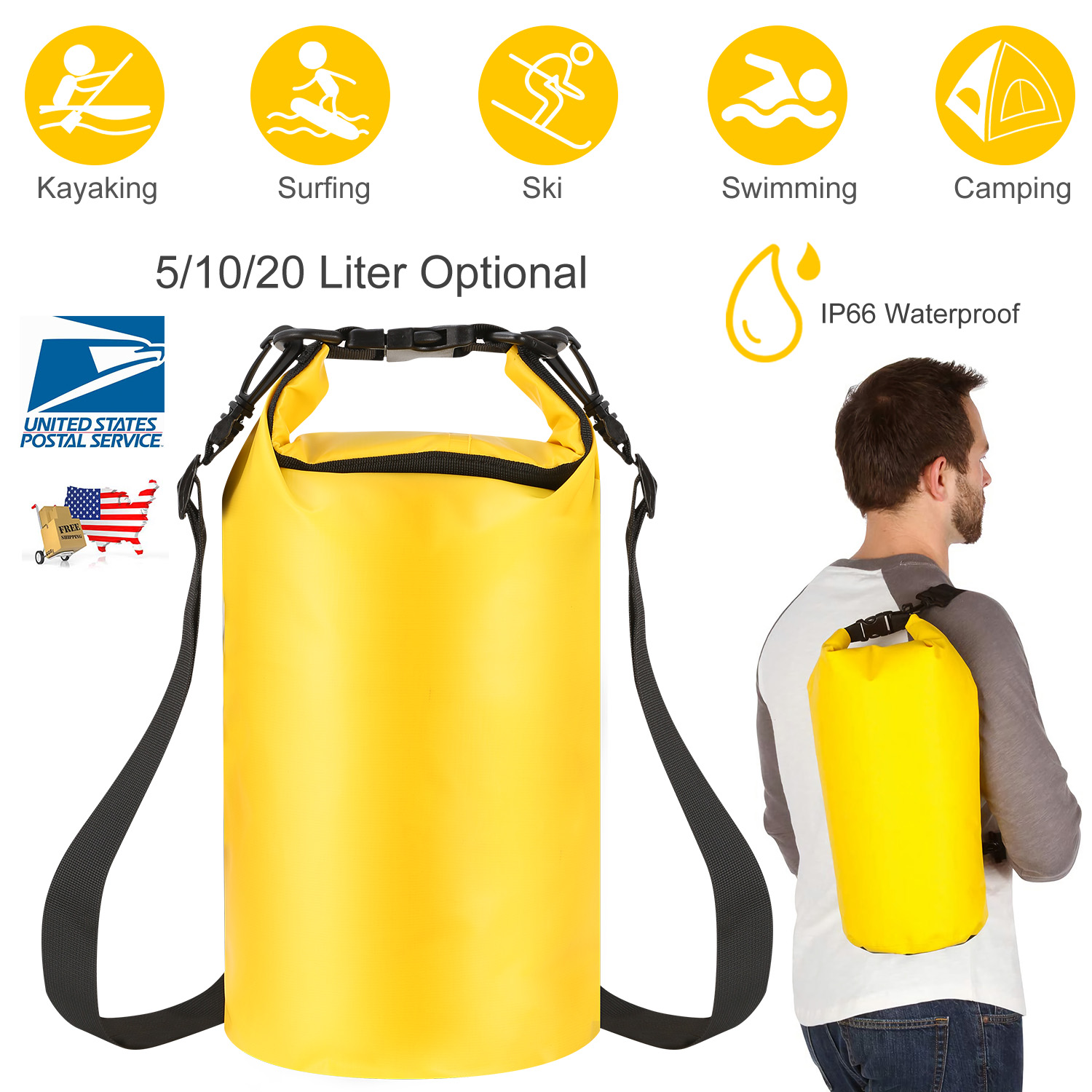We believe that protect your valuables is crucial for keeping a good mood during your outdoor adventures. So our waterproof dry bag is designed to keep your stuff dry, clean, safe and protect them from sand, dust, mud and snow to ensure you enjoy outdoors without worry. Whichever adventure you are going on, such as kayaking, canoeing, snowboarding, skiing, hiking, camping, etc., our IP66 waterproof dry bag is the gear you can truly reply on. Made of waterproof 500D PVC material, which features IP66 waterproof, compact and durable and determines that it’s an essential part of your outdoor gear kit! Come with 2 detachable shoulder straps for your option to use as as backpack or shoulder bag, so you won't be fettered by anything else while having fun!