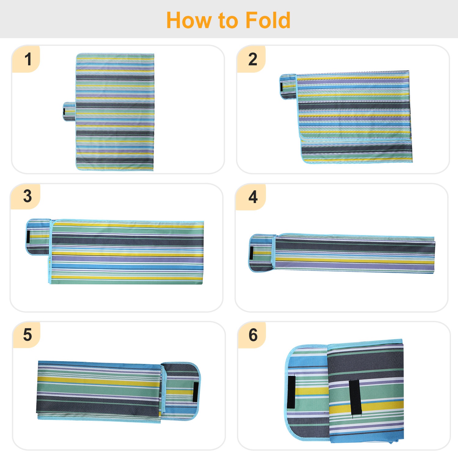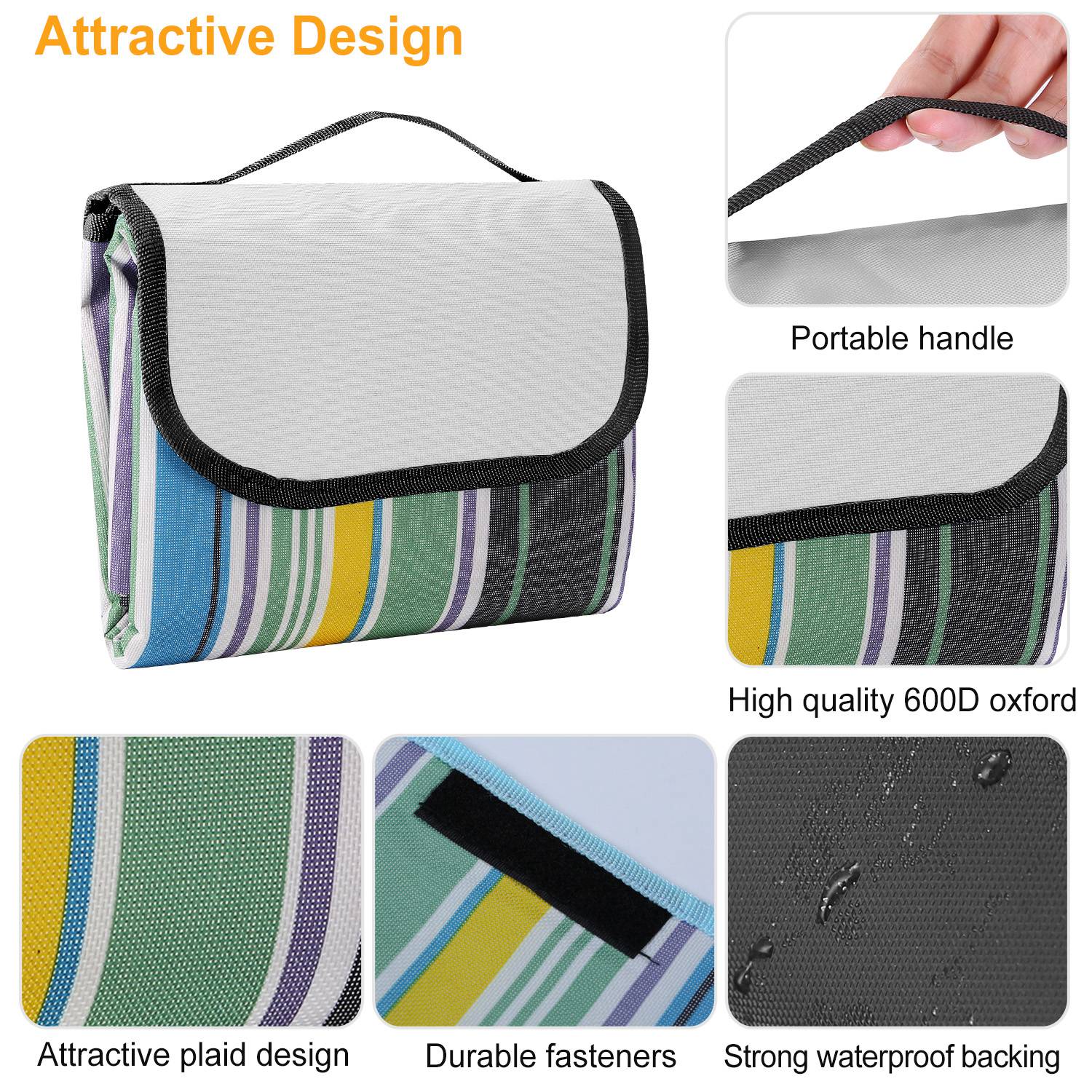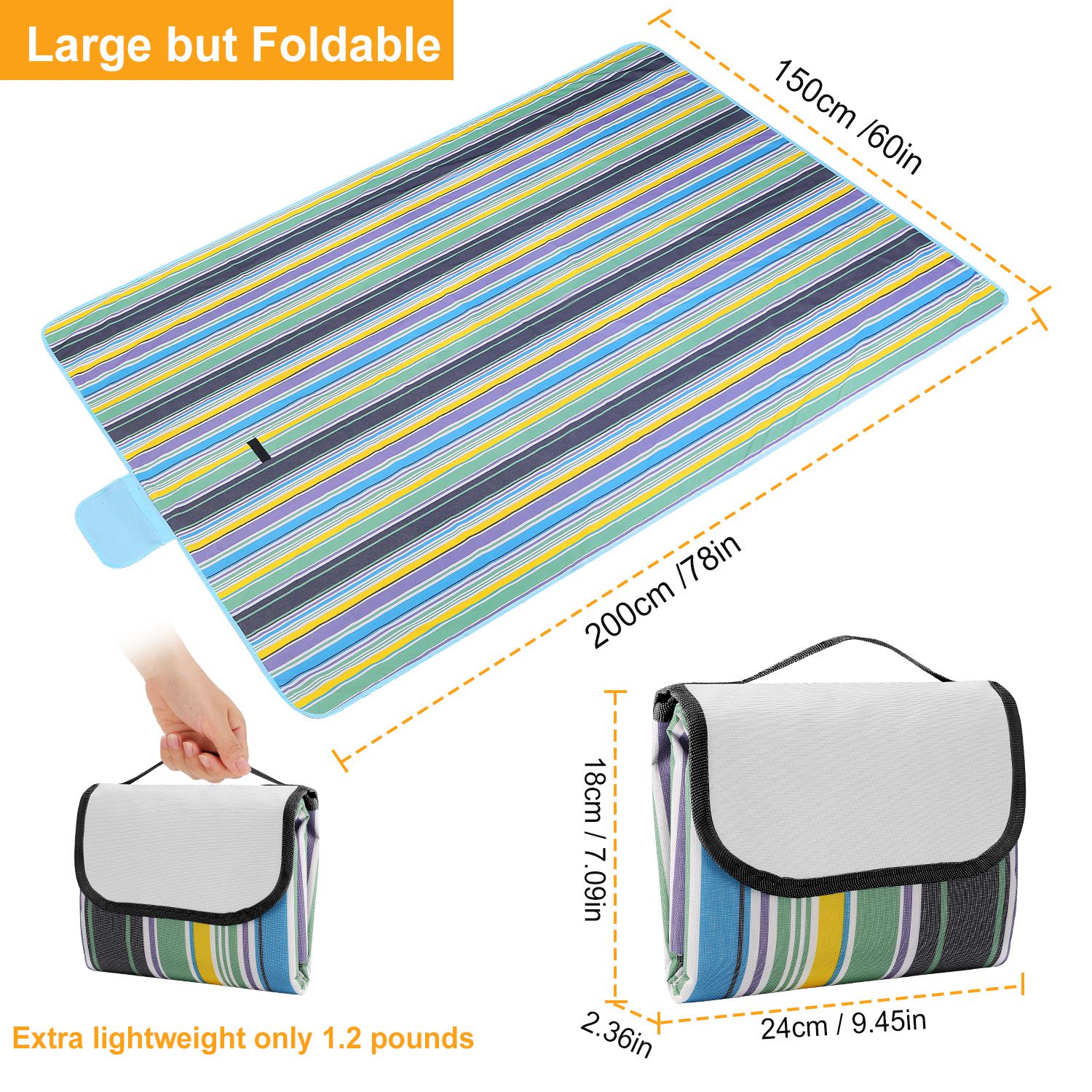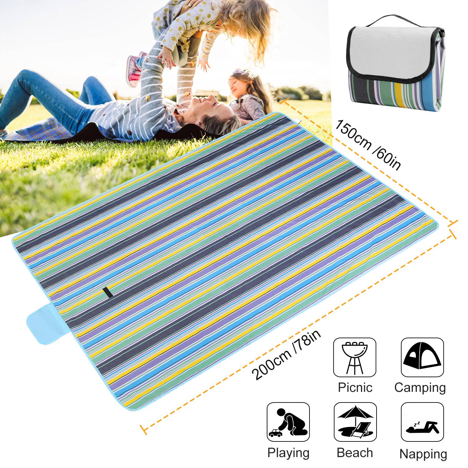Our picnic blanket unfolds to 60" x 78", large enough to comfortably seat 4 adults and folds to a compact 10.5" x 15" for easy storage. The 600D Oxford is weather-proof and mold- and mildew-resistant. Built in a durable and convenient handle, weight only 1.2 pounds, portable and easily thrown in a backpack or travel bag. Perfect for picnic, camping, outing and beach travelling.