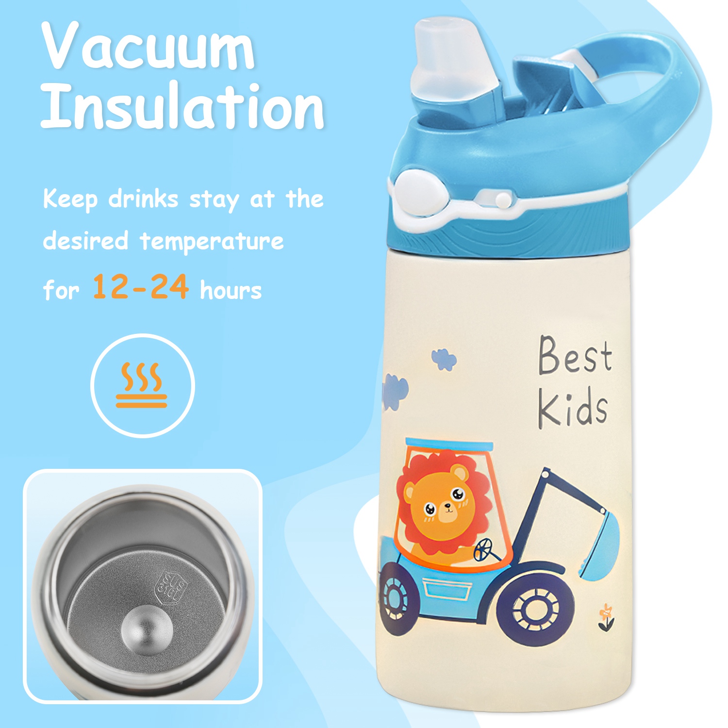 Our insulated bottle features 13.5Oz capacity and keeps drinks stay at the desired temperature for 12-24 hours, allowing kids to enjoy their preferred temperature beverages throughout the day. Also come with cute pictures on the bottle, which encourages kids to keep hydrated all the time. Made of premium 316 stainless steel, safe for children to use and free from harmful chemicals. The lock switch and push button ensures its leak-proof and long-lasting performance. Perfect for school, sports, swimming, or cycling. Perfect for toddlers, boys and girls!
