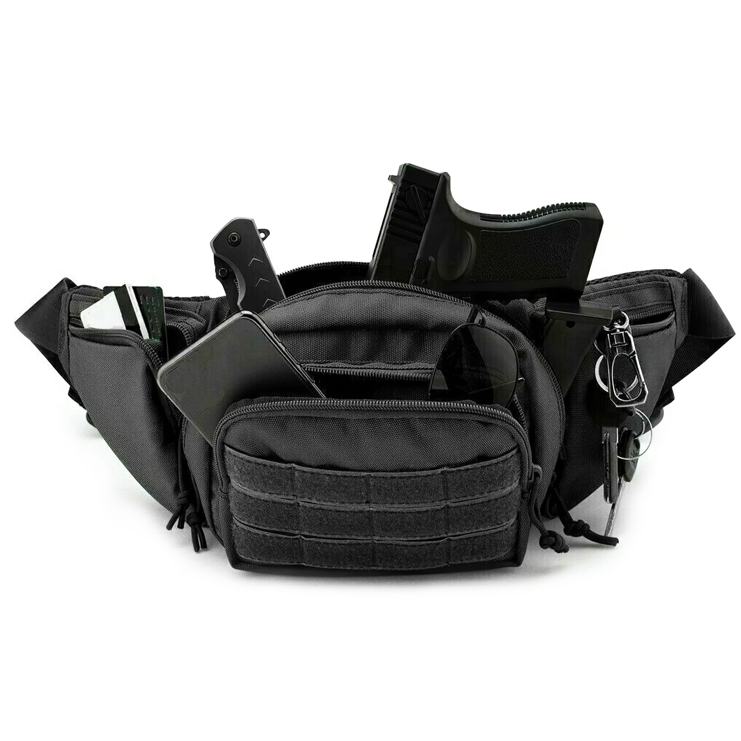 Crafted from premium oxford fabric, this concealed carry bag is tear and water resistant for outdoor excursions like walking, jogging, camping, hunting, and fishing as well as everyday EDC carry uses. Include 5 large capacity zippered pockets, keep your essential gadgets and devices organized on the go! Quick release buckle allows for rapid and easy access to the bag's contents. Modular Lightweight Load-carrying Equipment pouch enables you to hang your gadgets. Lightweight yet durable with an adjustable waist strap, an ideal companion for travelling.