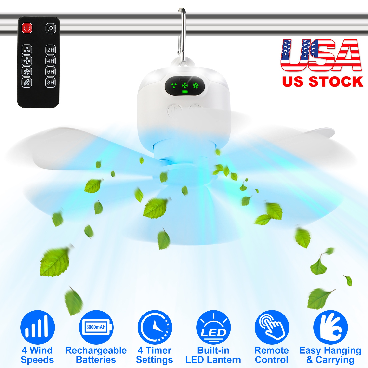 Enhance your outdoor experience with this versatile 2-in-1 camping fan and LED lantern. Perfect for camping trips, beach outings, or any outdoor adventure, this rechargeable camping fan provides both cooling airflow and bright illumination. With 4 wind speeds, 4 timer settings, low noise operation, and a digital display, it's designed for comfort and convenience. The detachable fan blades make it easy to store and carry, while the remote control adds to the user-friendly experience. Whether you're setting up camp or relaxing in your tent, this camping fan is your essential companion.