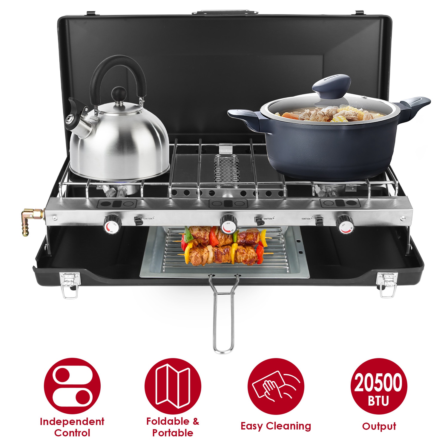 Whether you're going for an outdoor camping adventure, enjoying a relaxing picnic, throwing a BBQ gathering, having a party with friends, or even prepping for an emergency back at home, our camping stove is your ideal choice. Crafted from premium cold-rolled sheet and stainless steel, our camping stove is not only built to withstand the rigors of outdoor environments but also ensures it remains sturdy, solid, and stable throughout your adventures. Feature with 3 burners with independent control, giving you the flexibility to customize heat settings tailored to your cooking needs. Compact folding size means it can be effortlessly stored in your car trunk, utility room, or cabinet without taking up too much space.