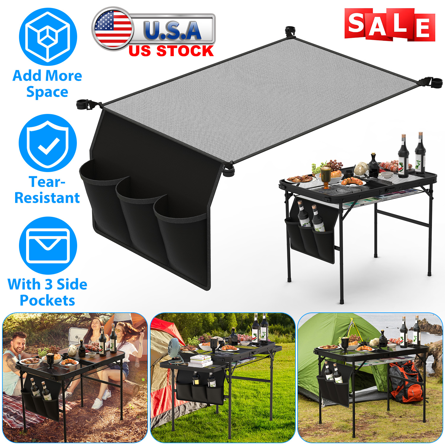 Hanging Storage Net for 35.43x23.62 Camping Table Under Table Folding Net Bag Tear-Resistant with 3 Side Pockets 4 Corner Clips for Camping Hiking Fis