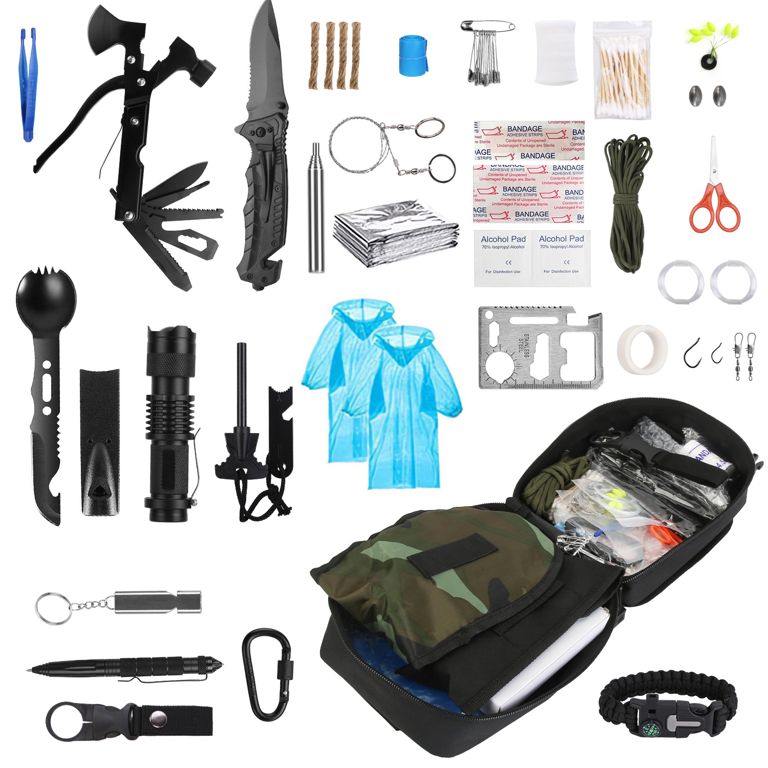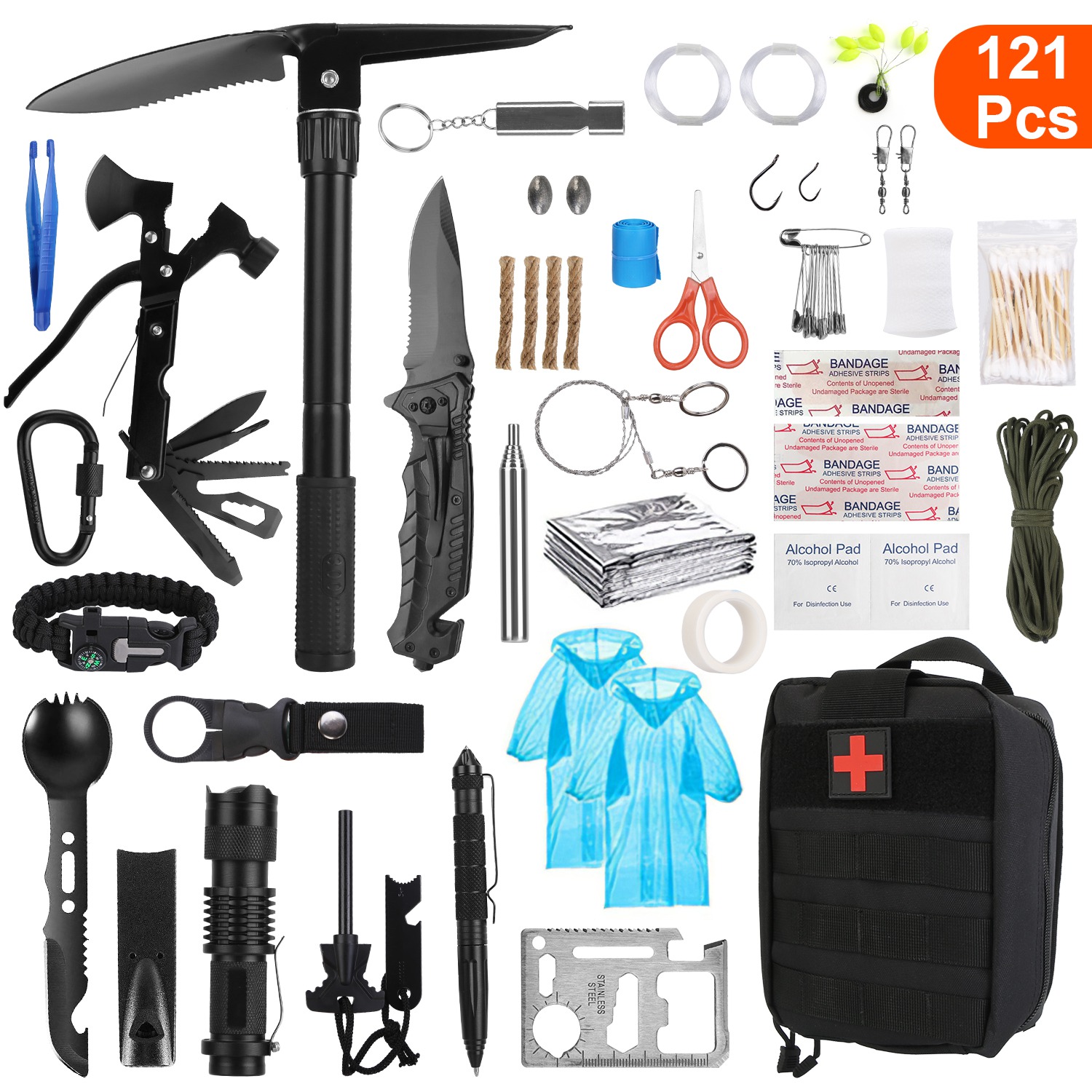 In the event of an emergency, it's of great significance to have the right supplies on hand. In the first 72 hours, a right survival kit can truly make a difference between life and death after a disaster occurs. This 121pcs survival kit contains all the necessary items, such as raincoat, multifunctional axe, shovel, tactical pen, flashlight, compass, first aid supplies, and etc.. A must-have for hikers, backpackers, mountain bikers, skiers, campers, and all outdoor enthusiasts who more likely find themselves in a survival scenario.