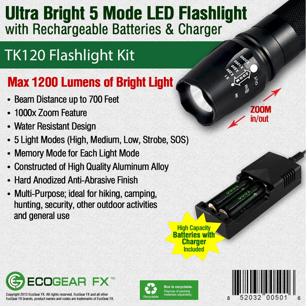 As an extremely rugged tactical flashlight, the TK120LED Flashlight Kit includes two high capacity lithium-ion rechargeable batteries and a rapid battery charger. Ideal for many situations and uses, the TK120 makes a perfect LED tactical flashlight with strobe. Not only is it great for professionals but makes a great flashlight kit for tactical situations, family camping, hunting trips, fishing and night patrols. It is a very useful LED emergency flashlight to aid in emergency assistance and natural disasters including earthquakes, hurricanes and storms.