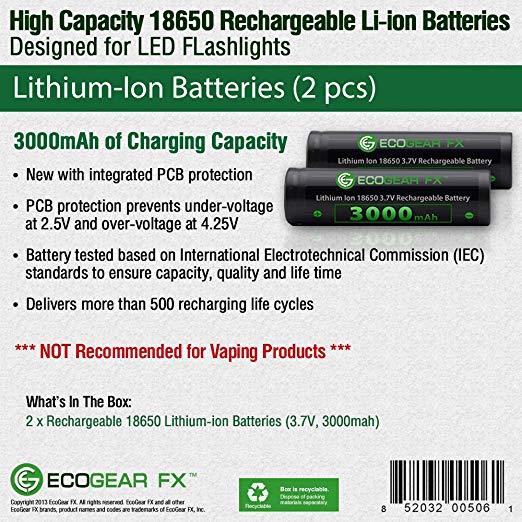 High powered 18650 lithium flashlight batteries offering 3000mAh of reliable power. The EcoGear FX 18650 button top lithium-ion rechargeable batteries are unique and are packed with an amazingly amount of powerful energy. This is our best 18650 battery as it provides dramatically increased longevity, low self-discharge, efficiency and optimized usage time. The choice battery for LED tactical flashlights and battery-powered professional gear.